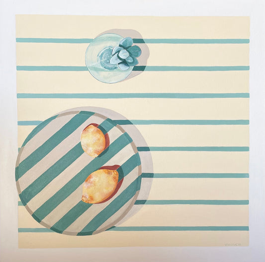 LEMON SQUEEZEE Still Life original painting, acrylic on canvas, framed in raw timber 65cm x 65cm by Vanessa McMahon-Maver