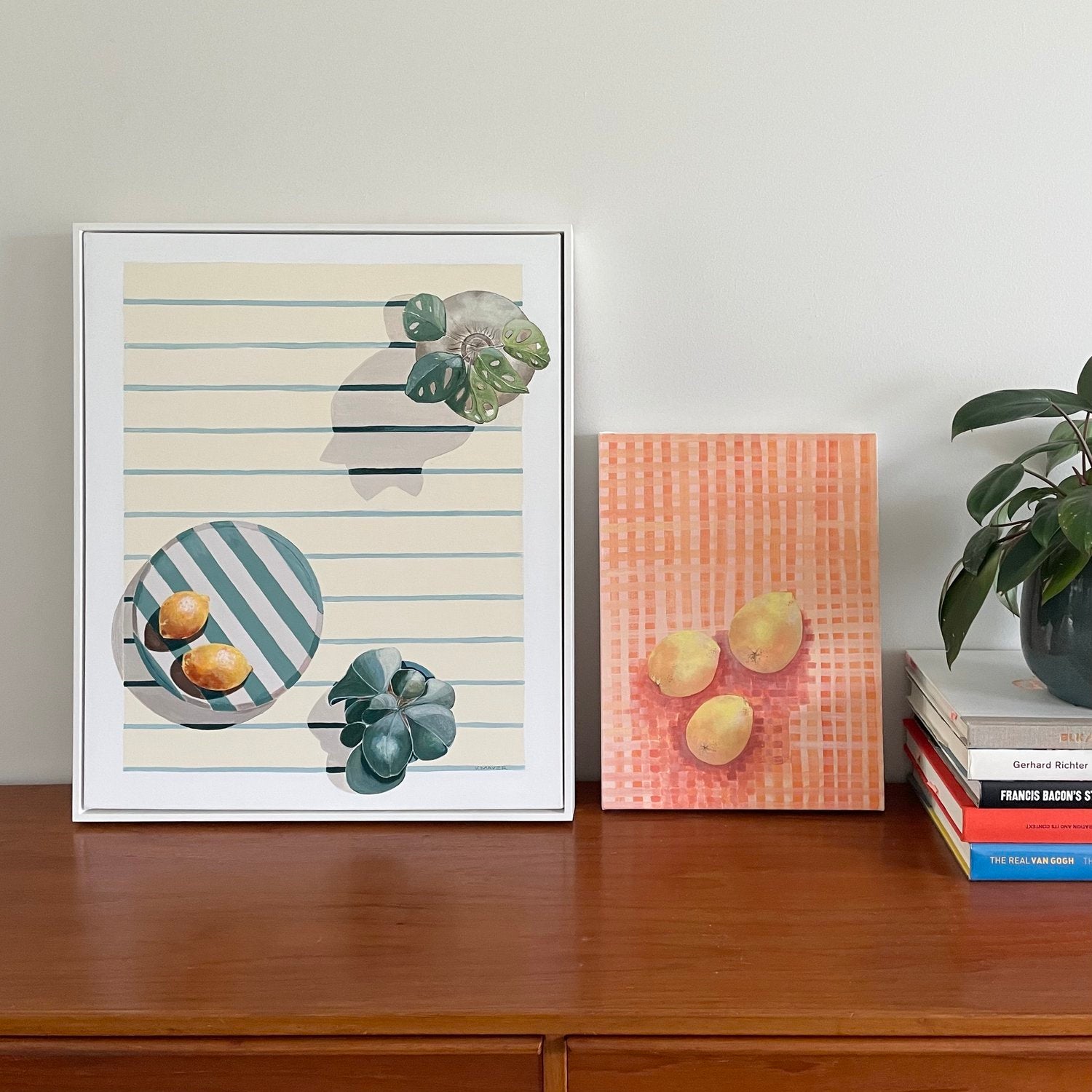 Zest of life, Still Life artwork by Vanessa Mave, is a fun piece, using pops of colour to create a scrumptious mix of textures, pattern and fruit.